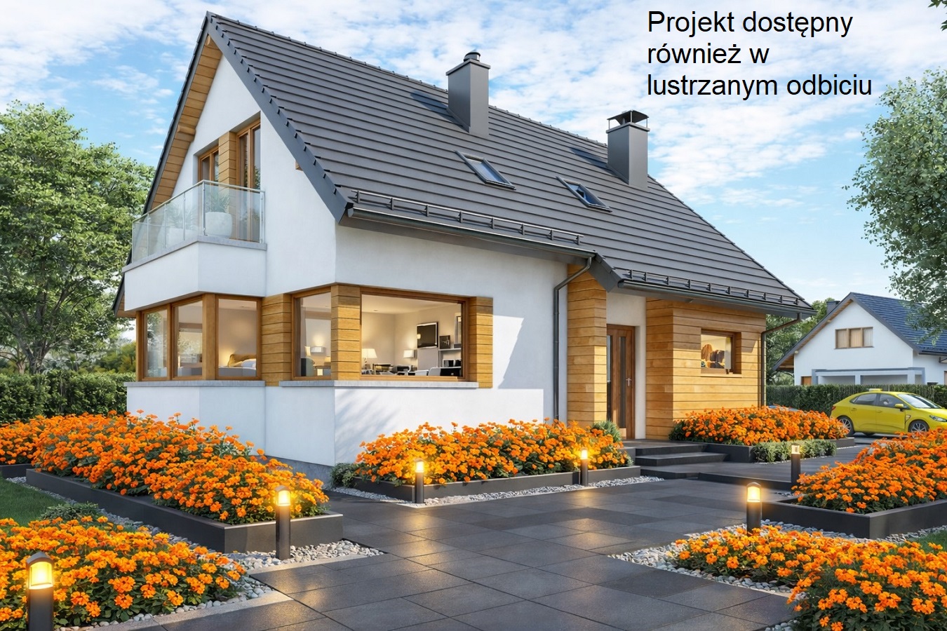 Przy ścianie szczytowej przewidziano przeszkolony wykusz powiększający pokój dzienny. W poziomie stropu nad parterem wykusz zwieńczono tarasem płaskim z balustradą.