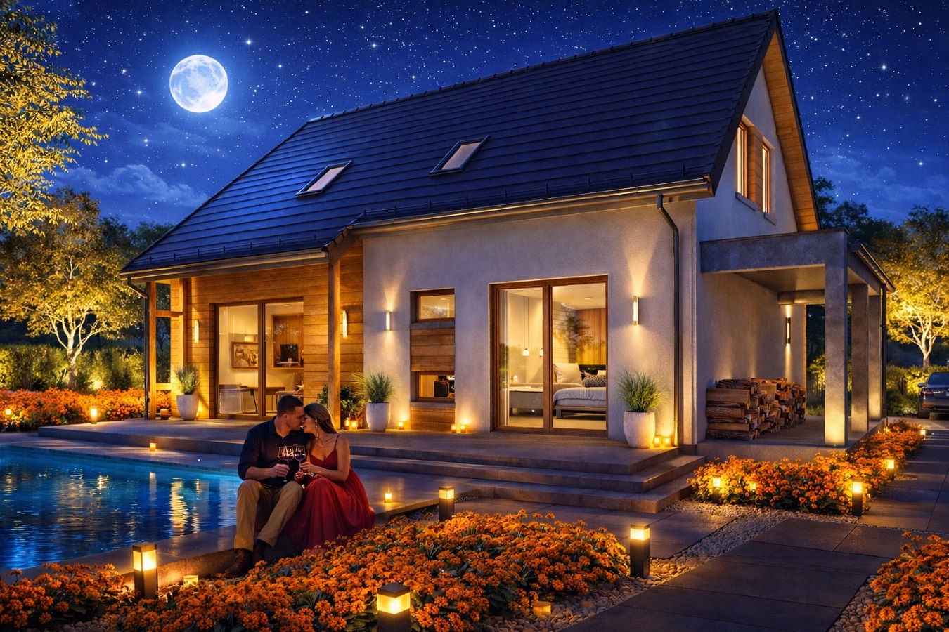 Zawiera wszystkie instalacje wewnętrzne: centralnego ogrzewania z kotłem na paliwo stałe lub na gaz ziemny, wod.- kan, c.w., gazową, elektryczną, solarną oraz odgromową.