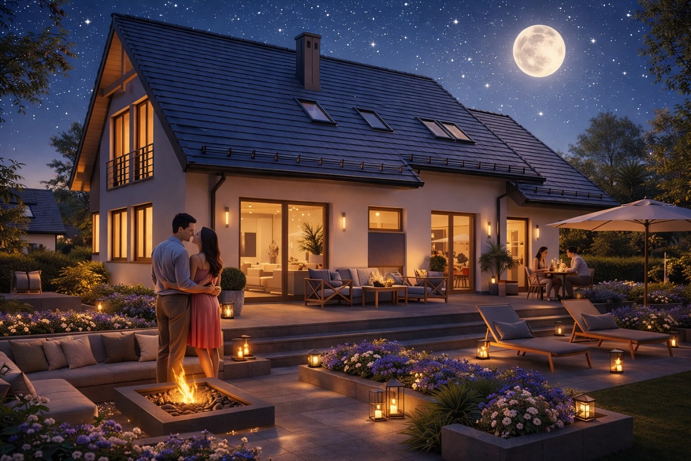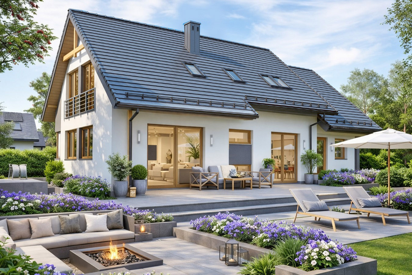 Zawiera wszystkie instalacje wewnętrzne: centralnego ogrzewania z kotłem na paliwo stałe lub na gaz ziemny, wod.- kan, c.w., gazową, elektryczną, solarną oraz odgromową.