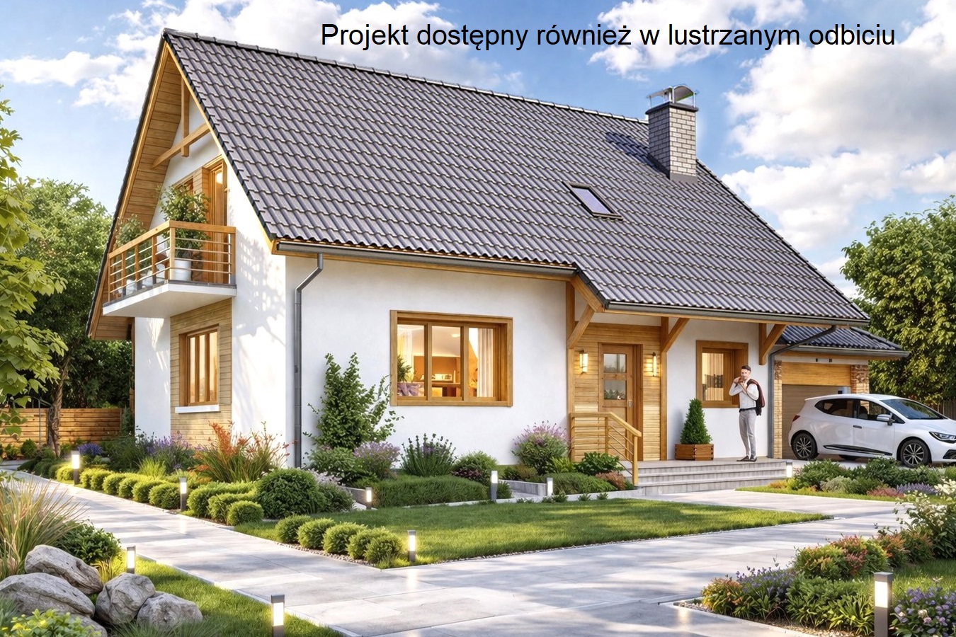 Projekt uwzględnia garaż dobudowany do ściany bocznej budynku. Dach nad garażem trzyspadkowy o nachyleniu 25° i 42° bez strychu.