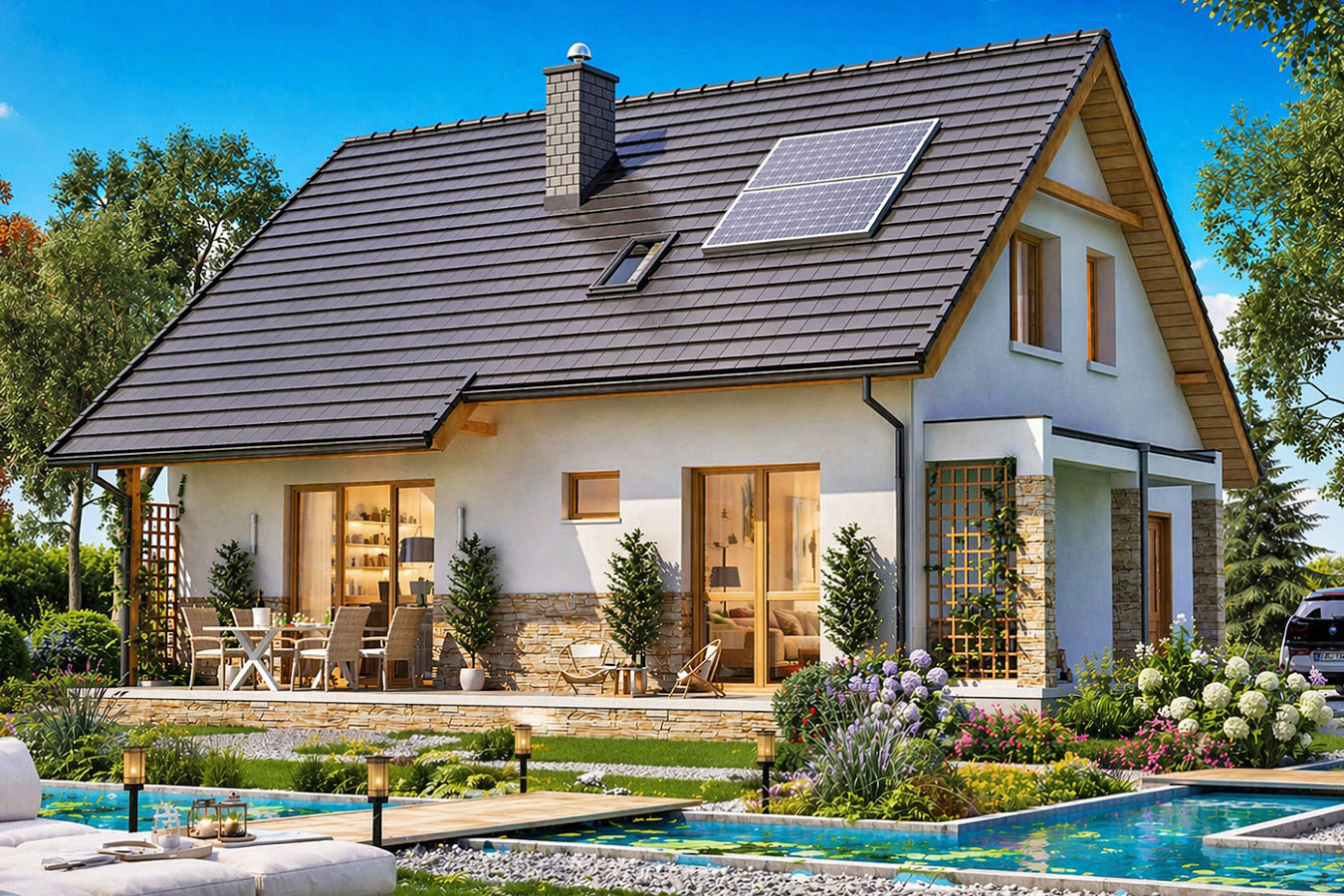 Zawiera wszystkie instalacje wewnętrzne: centralnego ogrzewania z kotłem na paliwo stałe lub na gaz ziemny, wod.- kan, c.w., gazową, elektryczną, solarną oraz odgromową.