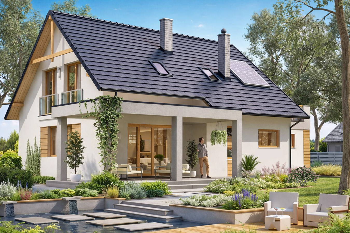 Budynek mieszkalny jednorodzinny, wolnostojący, parterowy bez podpiwniczenia, z poddaszem użytkowym i garażem 2-stanowiskowym (z dodatkowym stanowiskiem dobudowanym do ściany bocznej budynku).