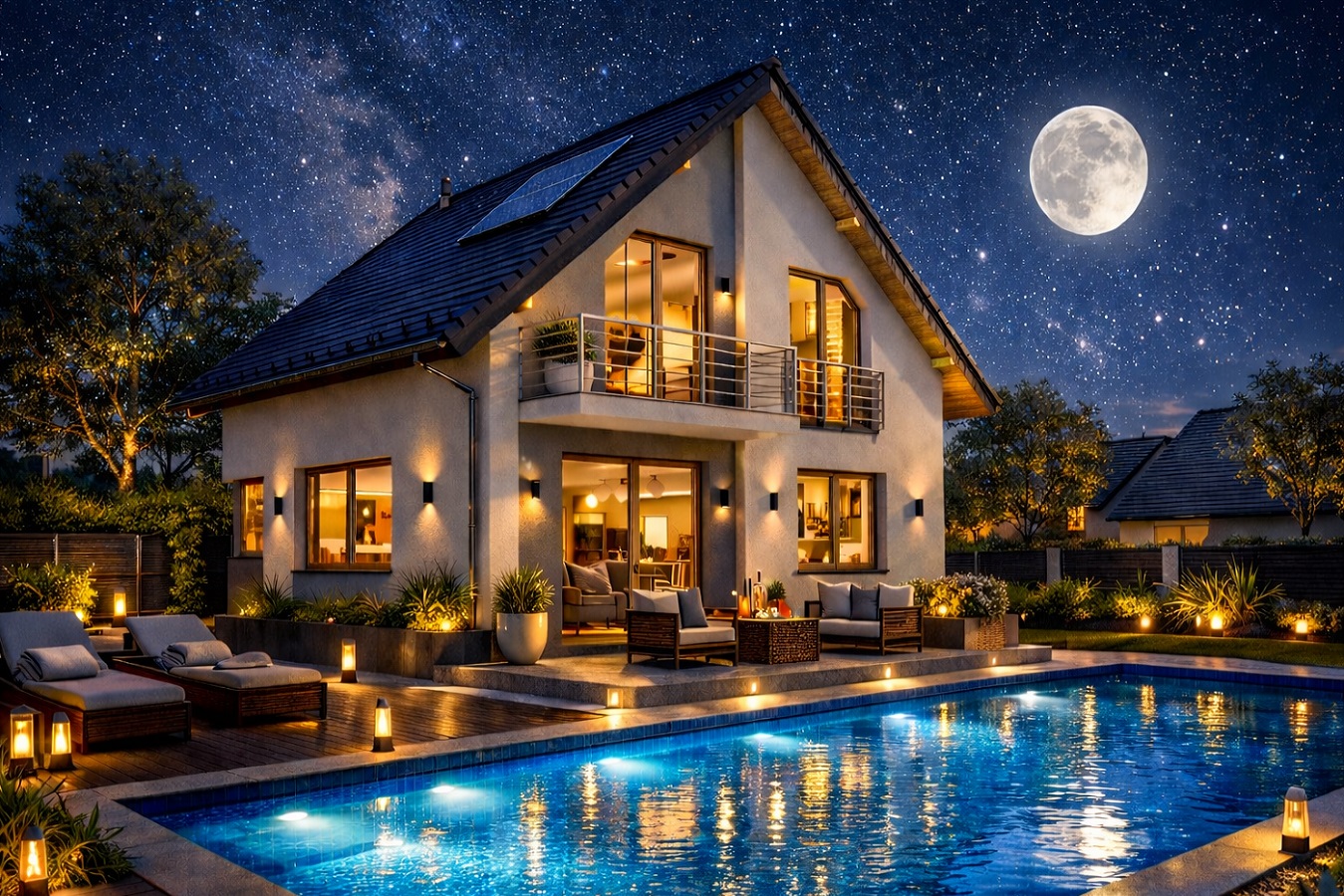 Zawiera wszystkie instalacje wewnętrzne: centralnego ogrzewania z kotłem na paliwo stałe lub na gaz ziemny, wod.- kan, c.w., gazową, elektryczną, solarną oraz odgromową.